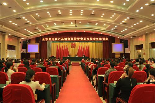 为全面落实《食用农产品市场销售质量安全监督管理办法》的正式实施,进一步规范我市食用农产品市场销售行为,加强食用农产品市场销售质量安全监督管理,保证食用农产品质量安全。4月13日、14日,由襄阳市食品药品监督管理局主办、襄阳职业技术学院继续教育学院承办的全市食用农产品销售监管暨快检业务培训班在襄阳市川惠大酒店举行。来自各县(市)区局分管领导、食品流通监管部门负责人、全市基层食药监管所食品快检人员和大型农贸市场、大型超市食品安全管理员、快检人员等350人参加培训。市食品药品监督管理局副局长席修璞、襄阳职业技术学院继续教育学院院长董珍文出席开班典礼。会议由市食品药品监督管理局食品流通监管科科长蔡武平主持。