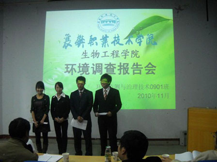 11月16日下午,生物工程学院“生命之舟”环保协会、环境监测与治理技术专业2009级学生环境调查报告会在人文楼112举行,产学研工作处项目管理科科长张润昊、生物工程学院副院长张代涛及相关教师及学生共80余人参加了报告会。