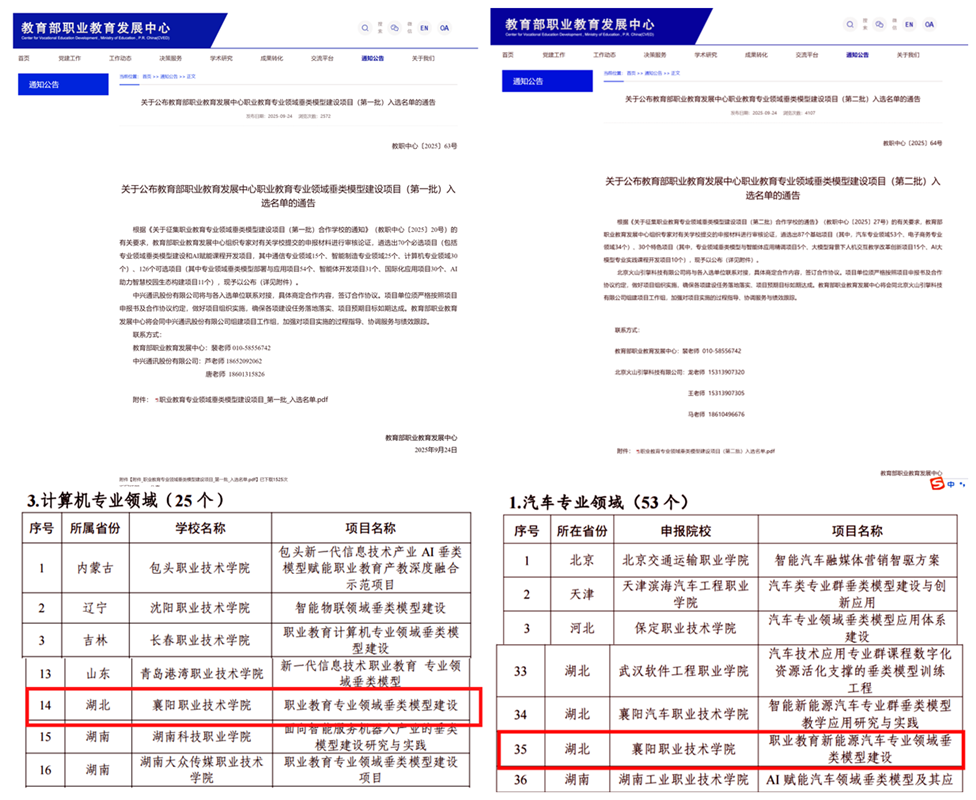 近日,教育部职业教育发展中心正式公布了第一批和第二批“职业教育专业领域垂类模型建设项目”入选名单。全国共有128所高职院校入选,覆盖通信、智能制造、计算机、汽车、电子商务等多个专业领域。经过积极申报与严格评审,我校计算机和新能源汽车专业领域共有2个项目成功入选。