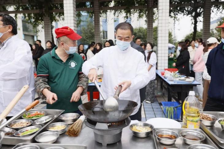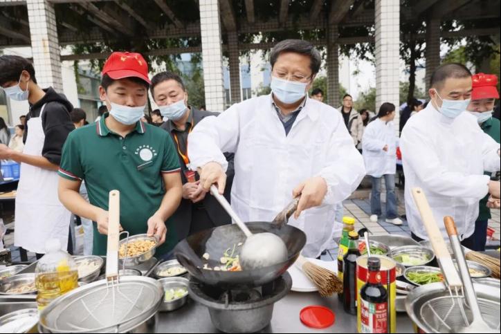 开幕式现场氛围热烈。最令人期待的环节当属“校长为我来掌勺”。陈礼龙、章伟现场化身“掌勺大厨”,熟练地翻炒食材,调配酱汁,分别制作了一道特色菜肴。现场掌声与欢呼声不断。“没想到,书记和校长的厨艺这么棒,这道菜里满是关爱与温暖!”品尝到美食的学生兴奋地说道。