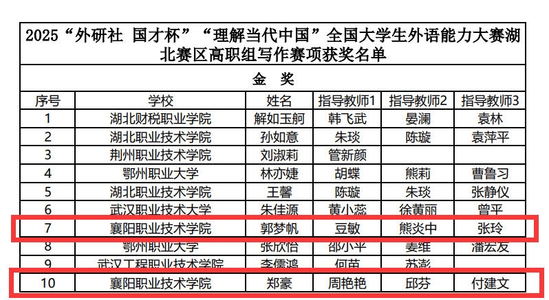 11月2日,由湖北省教育厅指导,武汉大学主办,湖北省高等教育学会大学外语教学专业委员会协办、长江职业学院承办的2025“外研社・国才杯”“理解当代中国”全国大学生外语能力大赛(湖北赛区)高职组写作比赛在长江职业学院顺利举行。本次比赛吸引了来自全省47所高校的104名选手(含英语专业组)参加。我校医学院康复治疗技术专业学生郭梦凡和医学检验技术专业学生郑豪双双斩获金奖。