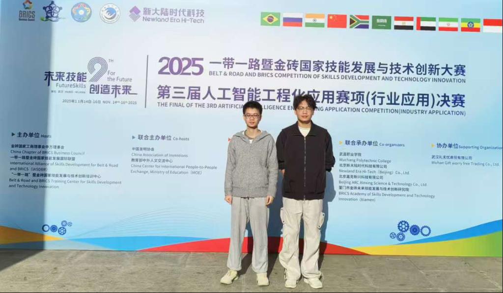 11月15日,2025“一带一路暨金砖国家技能发展与技术创新大赛——人工智能工程化应用赛项”全国总决赛在武昌职业技术学院举办。全国160余所高校的700余支队伍参与初赛,最终80余所高职院校的96支队伍晋级决赛。经过激烈角逐,我校信息技术学院物联网应用技术专业陈明斩获国赛一等奖,张益恒获三等奖;田勇、杨庆生两位教师荣获优秀指导老师奖,学校获优秀组织奖。