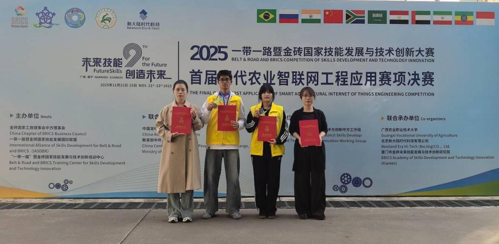 11月21日至23日,2025一带一路暨金砖国家技能大赛首届现代农业智联网工程应用赛项全国总决赛在广西农业职业技术大学举行。经过激烈角逐,农学院现代农业技术专业学生郭智伟、陈增幸获全国总决赛二等奖(银奖);学校荣获优秀组织奖。