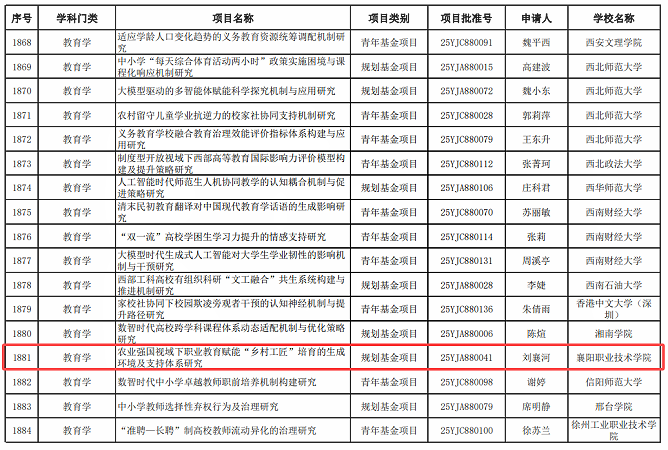 近日,教育部社科司公布关于2025年度教育部人文社会科学研究一般项目立项名单。我校副教授刘襄河主持的课题《农业强国视域下职业教育赋能“乡村工匠”培育的生成环境及支持体系研究》立项为规划基金项目。