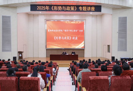 为深入贯彻落实教育部《关于加强新时代高校“形势与政策”课建设的若干意见》精神,充分发挥领导干部在宣讲党的理论、路线、方针、政策上的示范引领作用,助力学生成长。12月26日下午,学校党委书记陈礼龙在图书馆二号报告厅为学生们讲授了一堂生动精彩的《形势与政策》课。报告会由学校校长余荣宝主持。校领导耿保荃、陈静、杨华、赵劲松,机关处室负责人,各院部党总支书记、分管学生工作的副院长,全体辅导员及马克思主义学院教师代表参加活动。
