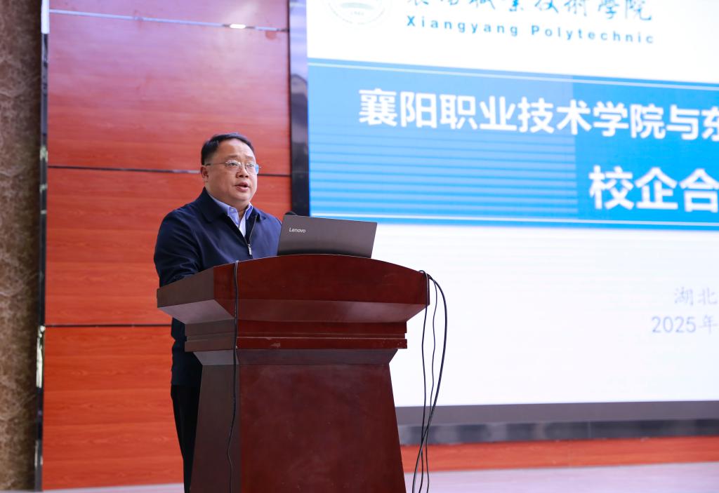 赵朋在致辞中表示,东风股份作为襄阳属地央企,与学院合作成果丰硕,近年来联合开展多项技能培训并输送大量人才。面对智能制造转型需求,企业将以学院为重要支点,通过“校企双元育人”模式共育高素质技术技能人才。此次活动正是双方深化产教融合、共担人才培养责任的具体体现。