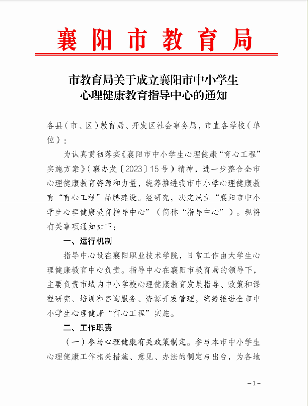 近日,襄阳市教育局发文批复,“襄阳市中小学生心理健康教育指导中心”正式落户我校。这是襄阳教育界对我校心理健康教育工作的充分认可,也标志着襄阳市大中小心理健康教育一体化建设迈入新阶段。