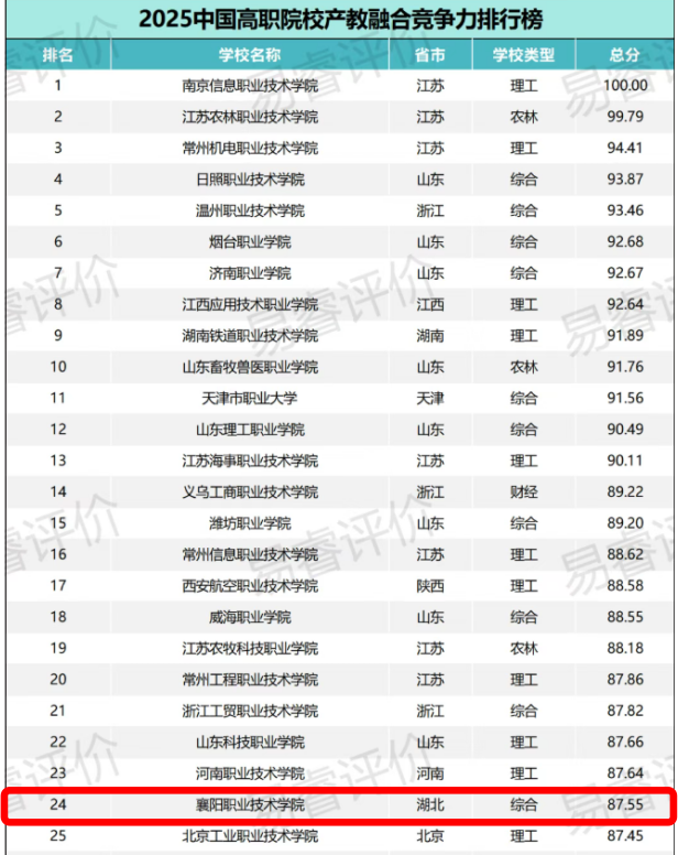 近日,易睿评价(eResearch)正式发布2025中国高职院校产教融合竞争力院校名单,全国共1401所高职院校参与排名,学校位列全国第24位、湖北省第1名。