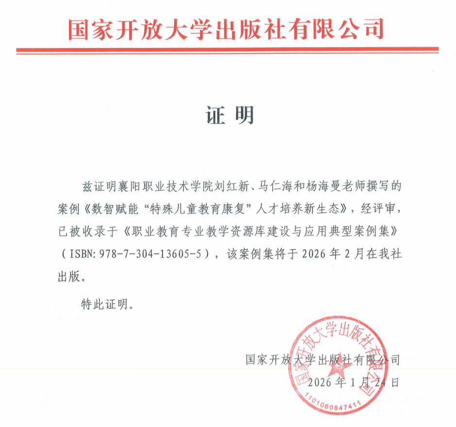 师范学院特殊教育专业教学资源库建设成果再获国家级权威认可。近日,由学校刘红新、马仁海和杨海曼三位老师撰写的案例《数智赋能“特殊儿童教育康复”人才培养新生态》,成功入选《职业教育专业教学资源库建设与应用典型案例集》(ISBN:978-7-304-13605-5),并将于2026年2月由国家开放大学出版社正式出版。