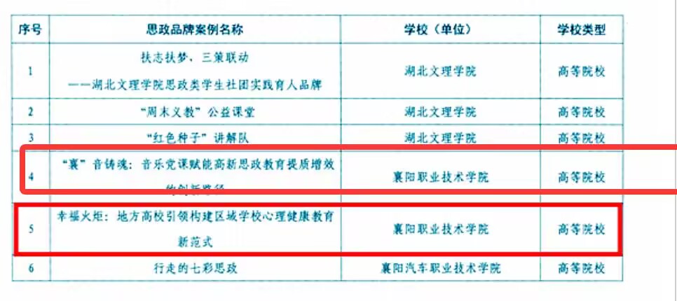 近日,襄阳市大中小学大思政课“双百”活动评选结果揭晓,我校师范学院报送的《“襄”音铸魂:音乐党课赋能高校思政教育提质增效的创新路径》,心理中心报送的《幸福火炬:地方高校引领构建区域学校心理健康教育新范式》凭借鲜明特色与扎实成效,成功获评襄阳市大中小学思政品牌案例。