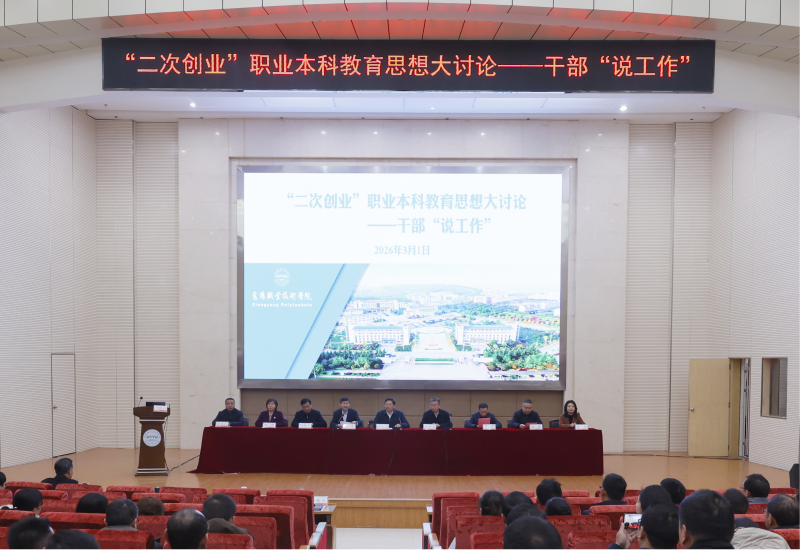 3月1日—2日上午,学校“二次创业”职业本科教育思想大讨论——干部“说工作”会议在图书馆2号学术报告厅召开。全体校领导、副科级及以上干部和“两室一中心”主任参会。会议由党委副书记赵涛主持。