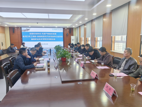 为聚焦技能培训、产教融合、校企合作,共谋人才培养与产业发展双赢路径,3月24日下午,我校在博爱楼举行校地合作座谈会。老河口市委统战部副部长、工商联党组书记陈琳,老河口市工商联主席雷子勖,老河口市装备制造与汽车零部件行业协会相关领导,学校副校长耿保荃、继续教育学院及汽车工程学院(智能制造学院)相关负责人参会。继续教育学院党总支书记王群主持会议。