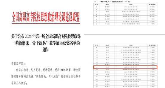 近日,全国高职高专院校思想政治理论课建设联盟举办的2026年第一场全国高职高专院校思政课“萌新磨课、骨干练兵”教学展示活动结果公布。我校马克思主义学院教师吴玫荣获“骨干练兵”组一等奖。