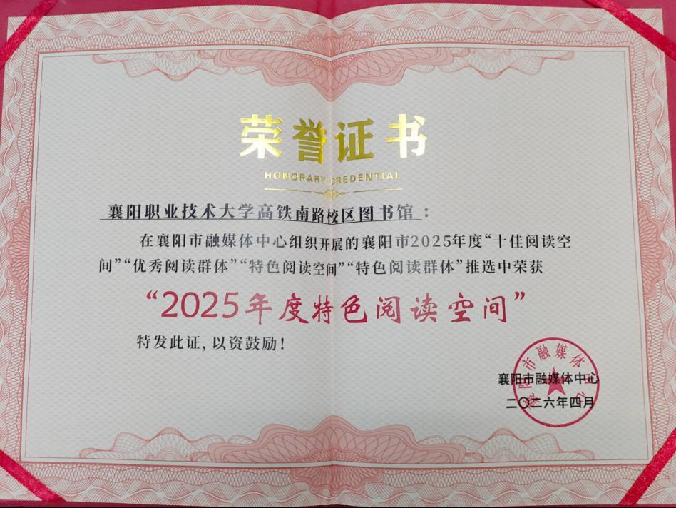 4月23日,我校高铁南路校区图书馆荣获2025年度襄阳市“特色阅读空间”称号。本次评选由襄阳市融媒体中心主办,旨在展示“书香溢襄阳”建设成果,弘扬全民阅读风尚。