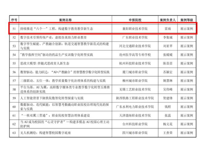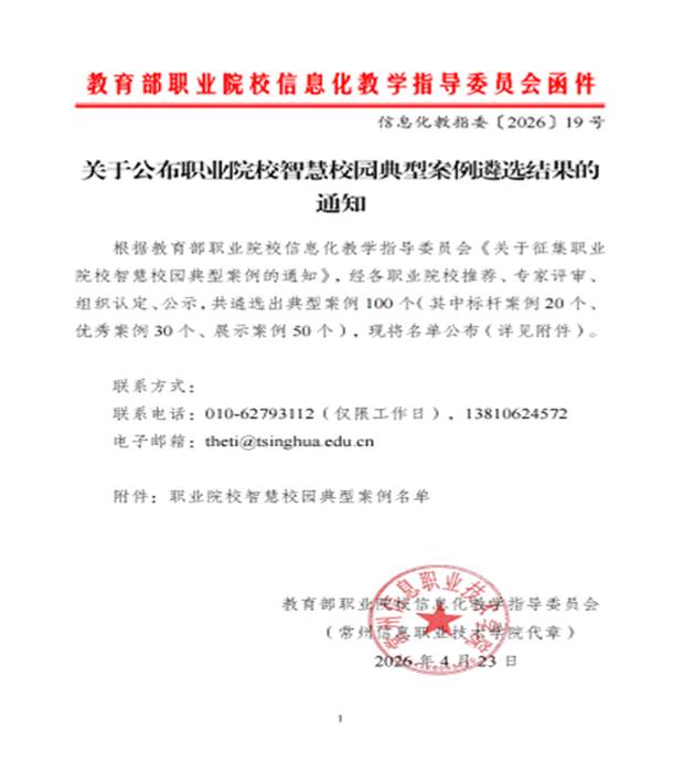 近日,教育部职业院校信息化教学指导委员会、教育部教育管理信息中心联合发布《关于公布职业院校智慧校园典型案例遴选结果的通知》,我校《持续推进“六个一”工程,构建数字教育教学新生态》案例成功入选展示案例,标志着学校在智慧校园建设、教育数字化转型领域再获国家级认可。