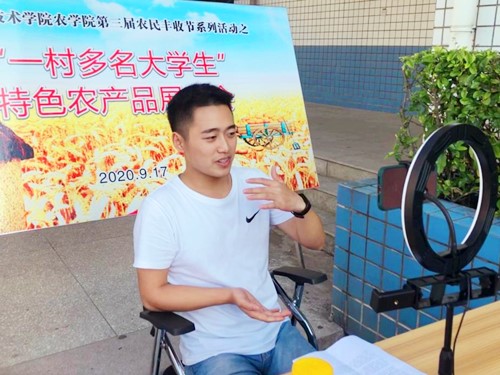 展销会上,农学院的学生代表借助抖音,帮同学网上直播售卖农产品,获得不错的反响