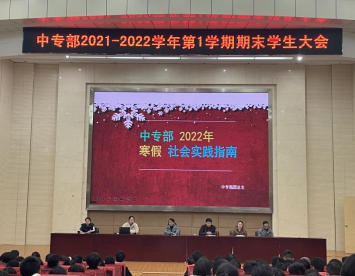 1月6日下午2时30分,中专部在图书馆二号报告厅举行2021—2022学年第一学期期末学生大会。会议由公共课部 中专部党总支副书记杨森主持。公共课部 中专部党总支书记陈建波、学工科长徐琛、团总支书记王亚斯、全体班主任、学生参加大会。