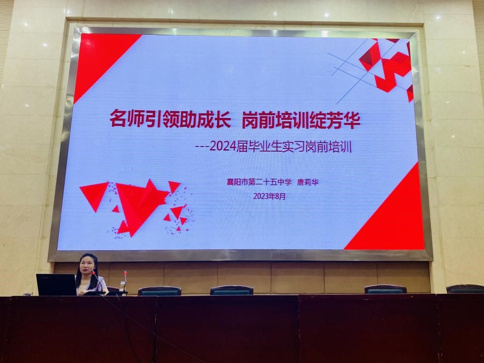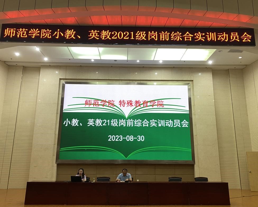 8月30日上午,师范学院小学教育、小学英语教育专业在智能制造大楼A栋四楼报告厅举办了岗前综合实训动员大会,特邀“隆中名师”“襄阳市小学数学名师工作室”负责人唐莉华为实习生作报告。师范学院实训指导老师及2021级小学教育、小学英语教育专业全体学生参加。会议由小学教育专业研究室主任陈学敏老师主持。