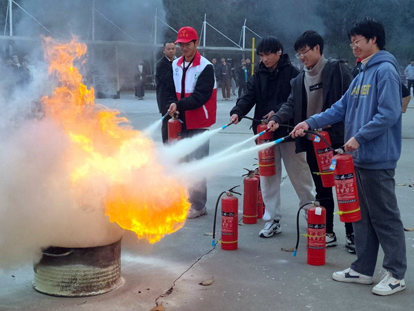 活动前,朱华兵对参加演练的学生开展培训。火灾警报拉响后,192名学生在每层楼学生干部的引导下,用湿毛巾捂住口鼻,按照既定的路线安全有序逃生、集合。集合完毕,朱华兵对逃生演练总结点评,并向大家讲解灭火器的正确使用操作方法,现场学生实操演练灭火。