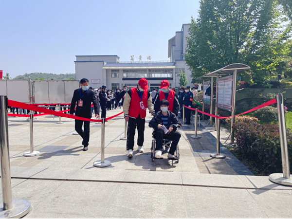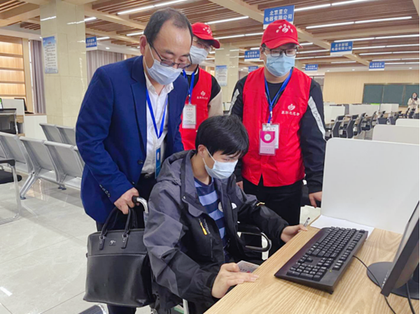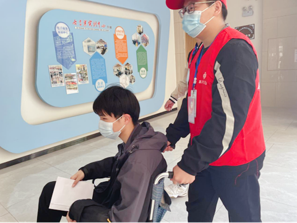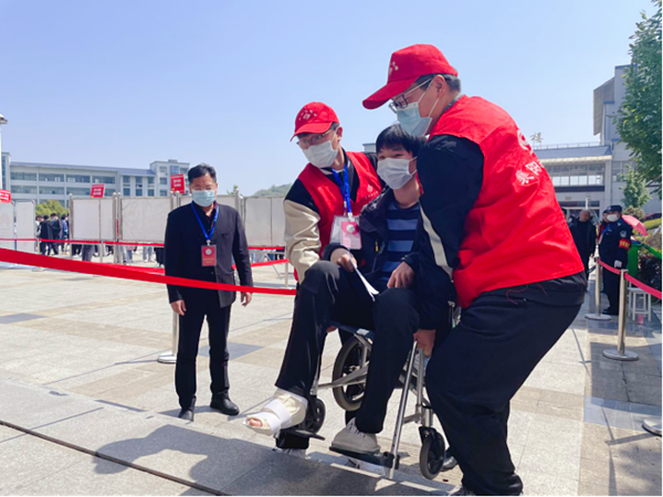 当天上午,敏行楼考点迎来了一位坐着轮椅的“特别”考生。“听老师说,下午有一位受伤的考生来我负责的考场考试,我感觉责任重大。责任感告诉我,一定要尽我所能,帮助他顺利地完成考试!”人工智能2001班负责导引工作的志愿者李思纬在同学和老师的帮助下,一路护送,将“轮椅”考生安全送到考场,助其顺利完成考试。