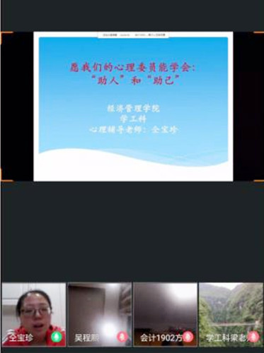 疫情期间,为减轻同学们的心理困扰,增强班级心理委员朋辈辅导的专业水平,4月30日,经济管理学院学工科心理辅导老师仝宝珍对各班心理委员开展了专题培训。