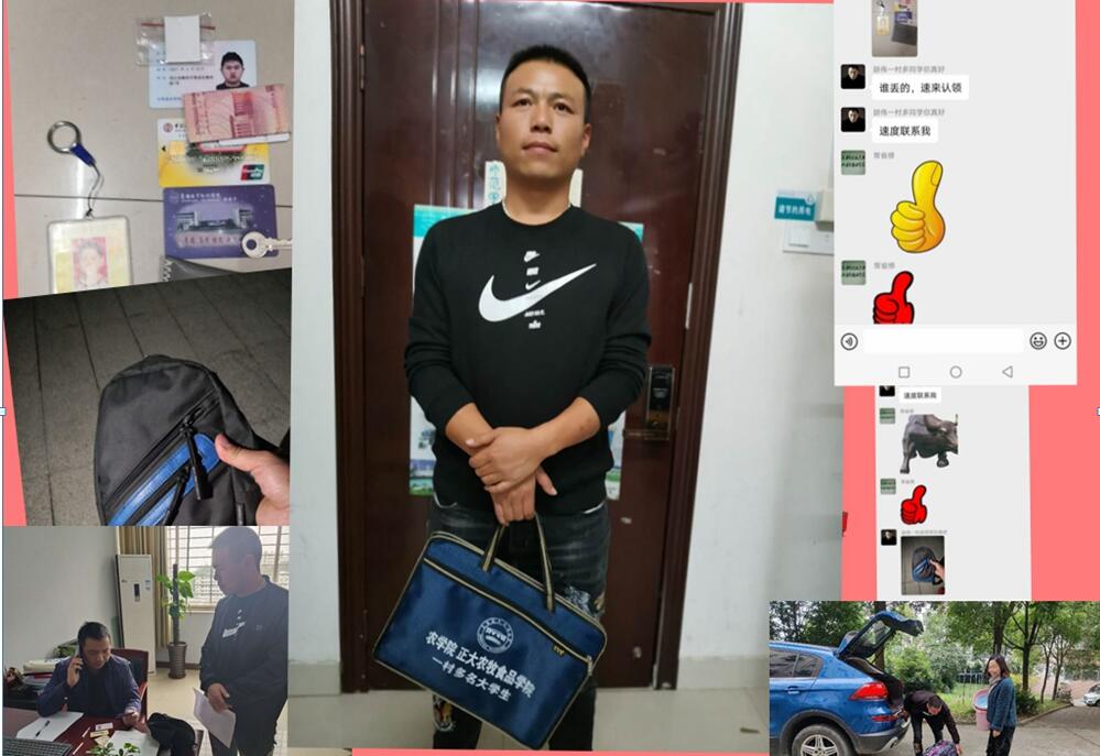 2020年10月26日晚20时,襄阳职业技术学院农学院食品营养与检测2002班的学习委员胡伟,完成了一天的学业,在教室回宿舍的路上,看到地上一个挎包。他纳闷了,这么大的挎包竟然也能丢下,是老师还是同学的?该有多着急啊!胡伟喊来其他同学,在同学的共同见证下胡伟打开了挎包,经过查看发现挎包里面装有身份证、学生卡、银行卡及现金,这让胡伟放心了,因为这是找到失主的最好线索。于是胡伟就在在襄阳职业技术学院农学院2020级“一村多名大学生计划”《吾爱吾生2020一村多》内部微信群内呼喊失主。微信群内出现了一个小高潮。为胡伟点赞的同学、老师络绎不绝.可是到了10月27日,胡伟依然在群里呼喊,失主还是没有联系他!10月28日,胡伟找到农学院学工科的领导,希望能够找到失主。