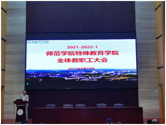8月28日下午,师范学院 特殊教育学院在图书馆1号报告厅召开全体教职工大会。与会人员严格执行戴口罩、间隔而坐等防疫要求。本次大会由党总支书记张丹主持。