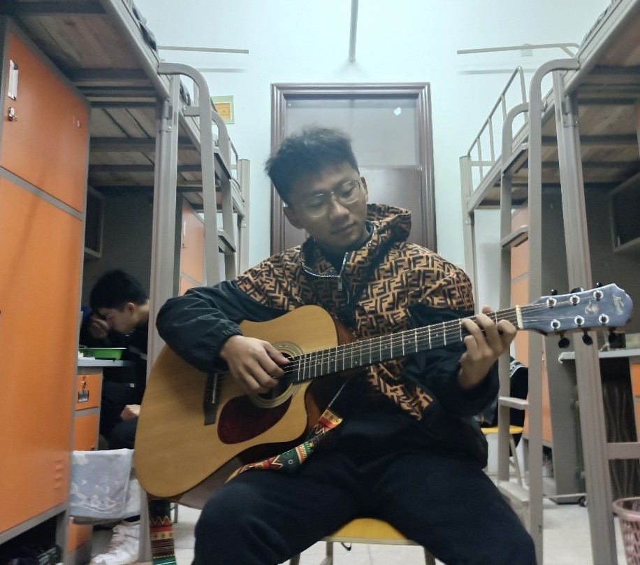 “我的爷爷奶奶住在管家巷,从屋里走到北门哼不完一首曲儿……”一阵悠扬的歌声从静六3010传出来。走进去一看,原来工业机器人2101班的张一坤正拿着吉他弹唱襄阳本土音乐《北门》。