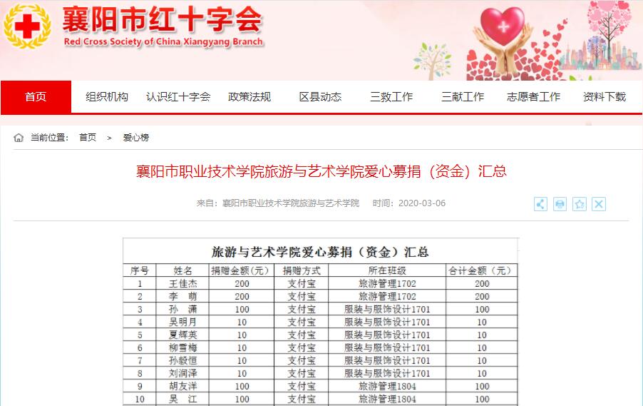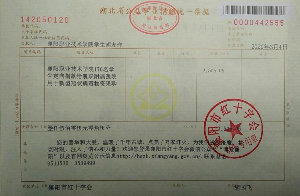 3月5日,襄阳职业技术学院旅游与艺术学院学生会主席胡友洋,代表学院全体学生将所筹集的3360.05元爱心善款,通过襄阳市红十字协会定向捐款给襄阳职业技术学院附属医院,用于疫情防控物资采购。