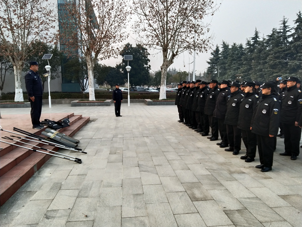 在梧桐广场,开展反恐应急演练。保安队长讲解、示范了各类反恐防暴器材的使用方法。随后,一名队员扮演歹徒,手持尖刀,不顾大门值守人员的劝阻,强行闯入校园,叫嚣行凶作恶。值守人员立即拉响警报,保安人员快速响应,操起防暴器械将歹徒制伏……