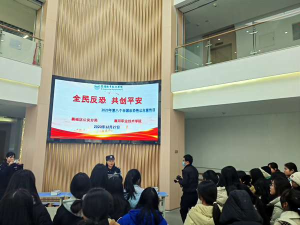 在博爱楼大厅,举行第八个反恐日“全民反恐 共创平安”宣传活动。隆中派出所余淼警官讲解了预防恐怖活动基本知识,介绍了如何正确识别、举报涉恐可疑情况,自觉抵制恐怖主义思想。现场发放了《反恐知识手册》,发布了《反恐普法宣传》官微,筑牢反恐防范安全防线。