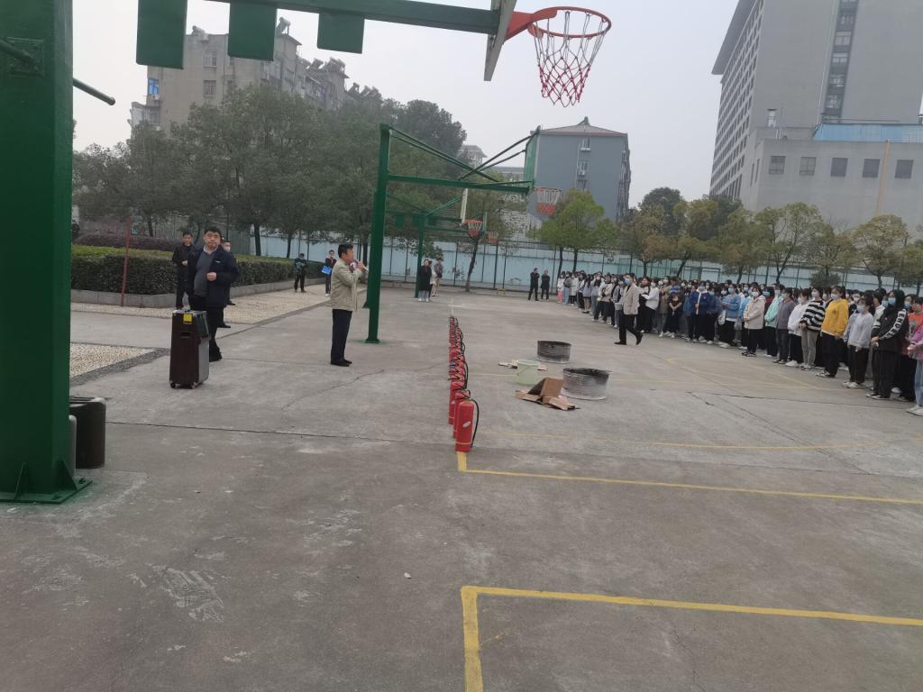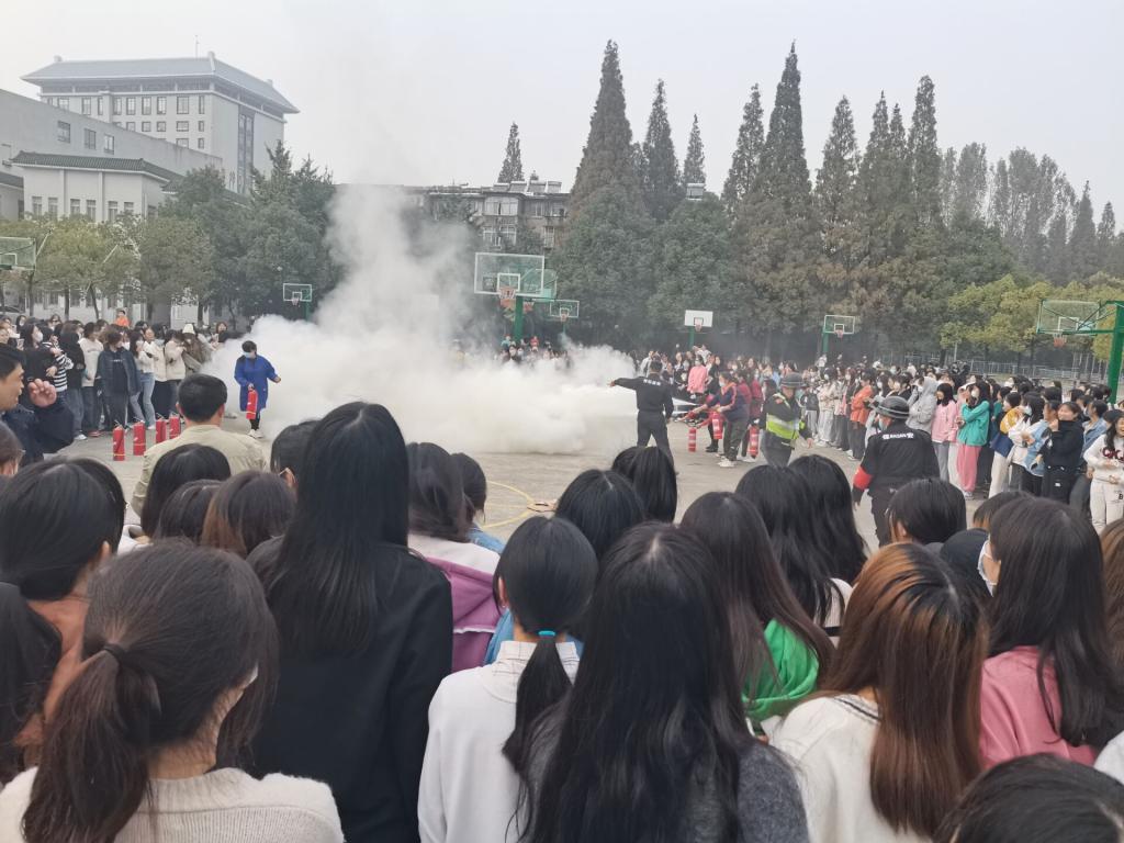 宿舍楼前,经过学习,同学们有序地拿起灭火器,拔掉安全插销,提起软管,对准起火点的根部,准确按压,一气呵成,火迅速被扑灭。