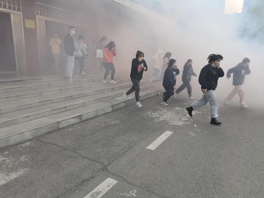 “看楼下好大的烟雾啊!快,毛巾打湿,捂住口鼻,低腰顺安全通道有序撤离!”一名学生干部指挥着。“报告宿管员,201宿舍全体学生已经撤离到安全地带;报告!305宿舍……”各寝室长大声向宿舍管理员报告。学生则迅速有序地沿宿舍楼道跑出,到达应急集合点。