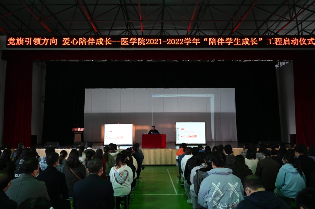 11月23日下午,医学院在南校区大学生活动中心举行“党旗引领方向 爱心陪伴成长”2021—2022学年“陪伴学生成长”工程启动仪式,医学院、机关第二党总支第五党支部、离退休人员工作处、继续教育学院、后勤产业服务总公司共一百余名党员及结对学生和班主任参加活动。医学院党总支书记佘传江主持。