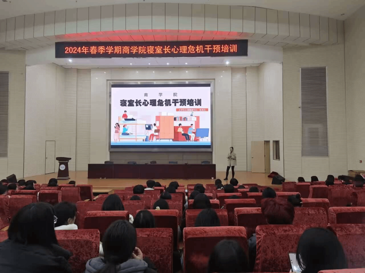 3月7日晚,商学院邀请大学生心理健康教育中心教师张竞月,为全体寝室长和心理委员作大学生心理危机干预培训。