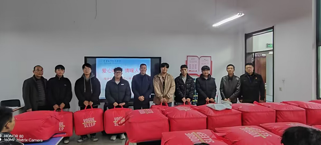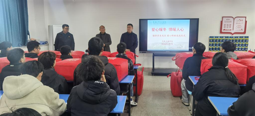12月4日下午, 汽车工程学院在智能制造大楼C101为47名困难学生发放爱心棉被。汽车工程学院党总支书记王群、党总支副书记龚文华、学工副院长韩向东、学工科长刘翔、组织委员胡升耀等参加了现场发放活动。