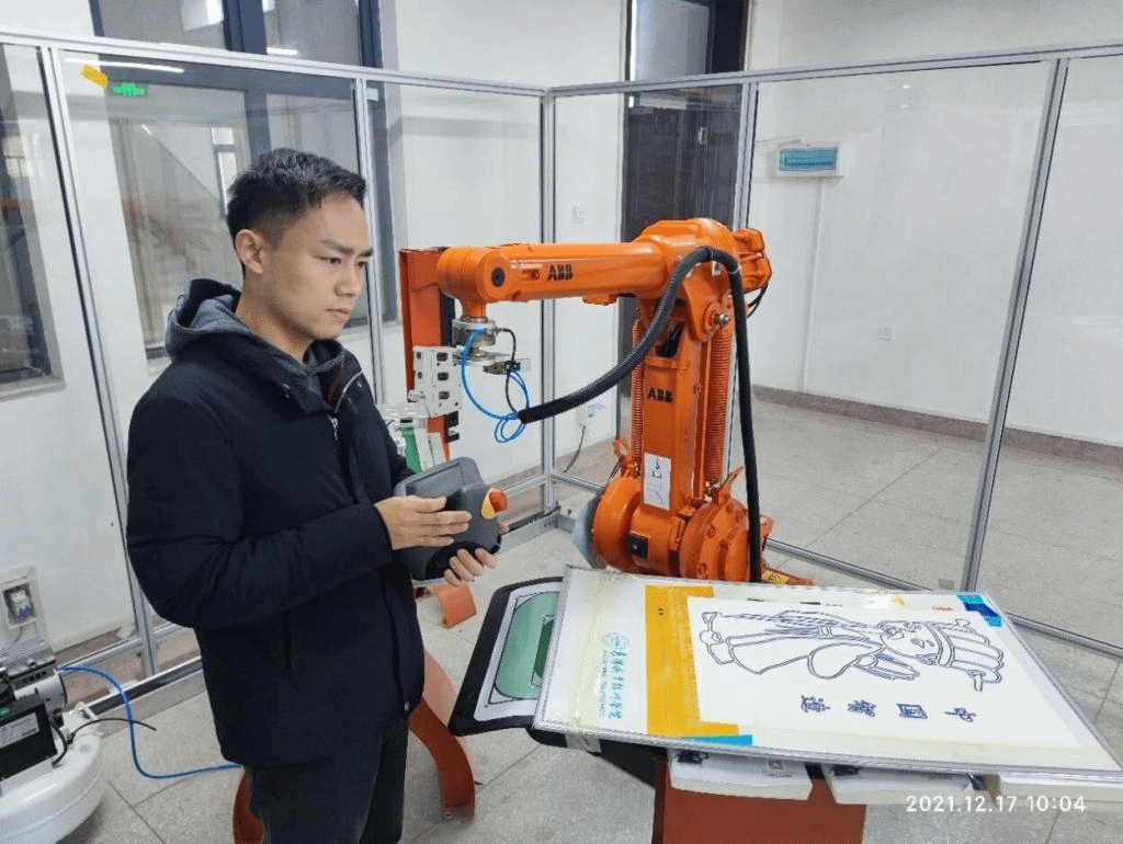 12月17日上午,工业机器人教研室公相、秦凯歌两位老师利用课余时间,操作工业机器人完成了一幅字画。画中有卡通版诸葛亮和“中国智造”四个大字。秦凯歌说:“诸葛亮是襄阳文化标志,最能体现襄阳特色。书写‘中国智造’四个字,一是因为工业机器人是智能制造的产物;二是歌颂新时代,中国制造向智能制造转型。”