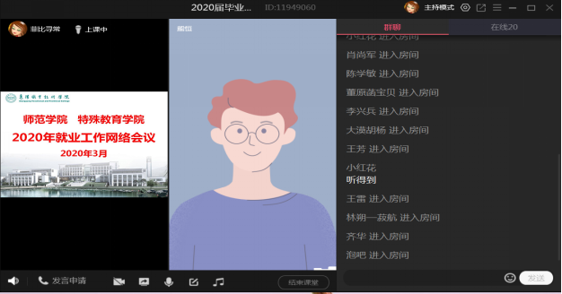 疫情防控当前,师范学院(特殊教育学院)“停课不停工”,积极开展新形势下的就业工作。3月15日上午9点,师范学院就业办牵头召开了2020届毕业班班主任就业工作专项网络会议。师范学院党总支书记张丹、副院长吴卫明参加会议。
