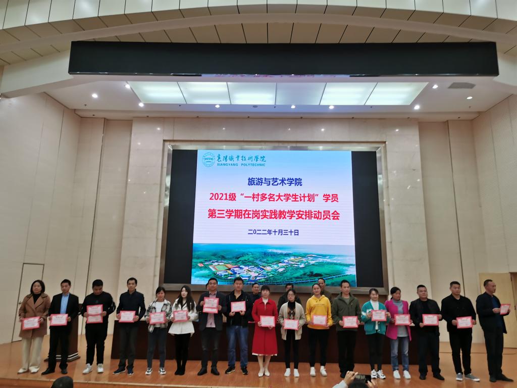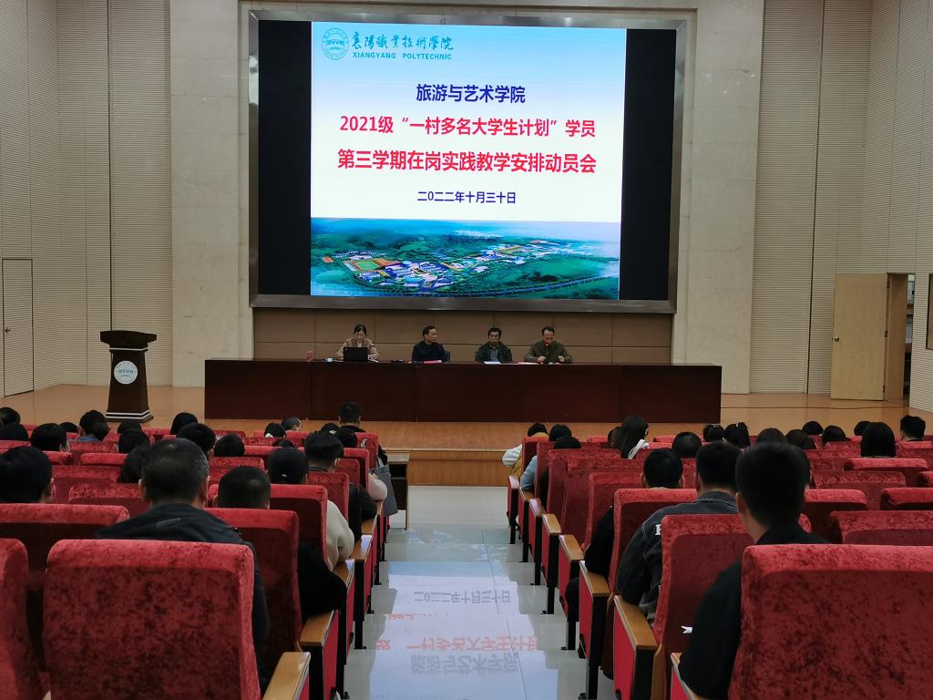 根据2021级旅游管理(一村多名大学生)人才培养方案“淡出旺归、阶段培养”的培养要求,2022年11月1日—2023年1月15日为学生在岗实践阶段。为帮助学生明确学习任务,达成学习目标,2022年10月30日上午,旅游与艺术学院在图书馆2号学术报告厅召开“一村多”学员实践教学动员会。旅游与艺术学院党总支书记王壮、副书记吴天中,副院长张菊芳、涂进喜,2021级“一村多”班主任以及全体“一村多”学员参加了此次会议。