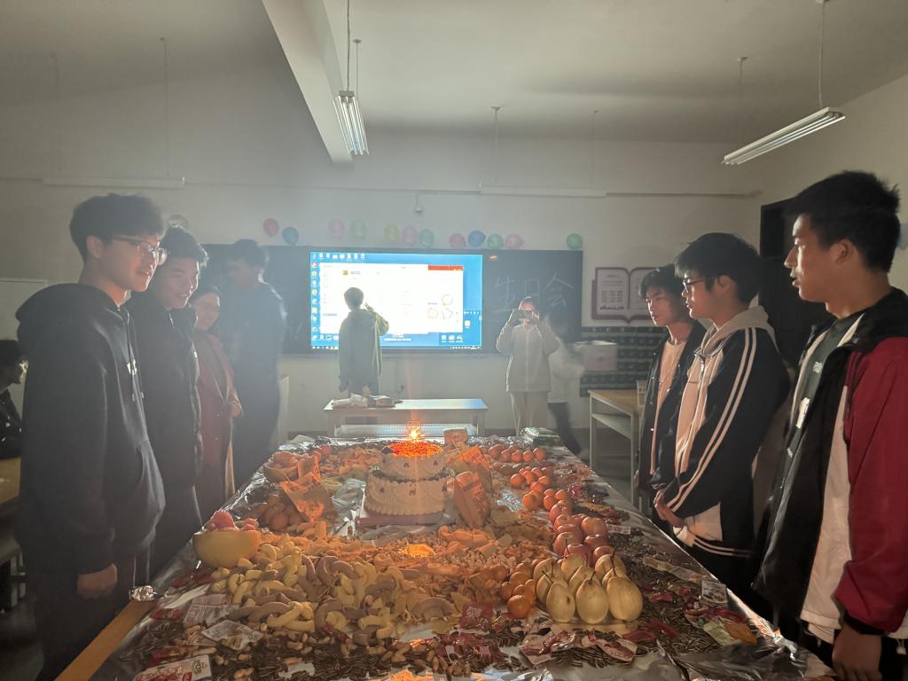 生日会现场,一块带有汽车工程学院LOGO印花的蛋糕置于中央,周边环绕苹果、香蕉等水果,黑板上“集体生日会,你我同行”显得温馨、喜庆。师生们一起点亮生日蜡烛,共唱生日歌。同学们由拘谨到放开,由惊喜到感动。一个蛋糕、一次集体生日会,传递的是衷心的祝福,温暖的是同学们的心。