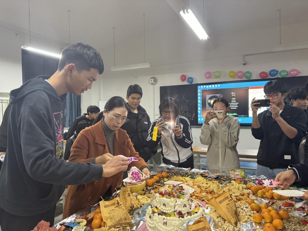 11月23日晚,汽车工程学院在智能制造大楼C 503教室为工业机器人2301班的学生举办集体生日。汽车工程学院副院长韩向东、学工科科长刘翔、团总支书记孙兆轩、班主任李雪婧参加生日会。