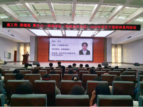 11月14日下午,筹备已久的师范学院(特殊教育学院)2020年度学生干部“说工作”活动在制造大楼报告厅如期举行。此次活动是学生干部培训系列活动之一。全体学生会、团总支、宿管会,以及新生班干部等400多名学生参加。