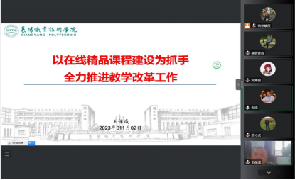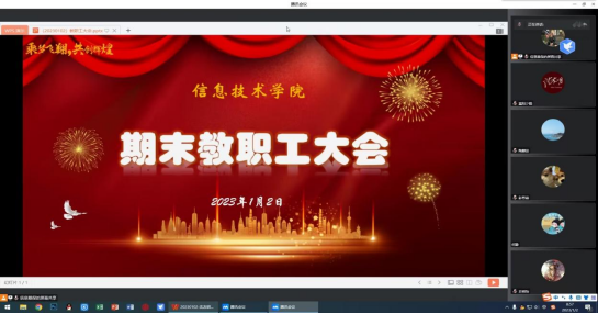 2023年新年伊始,信息技术学院全体教师齐聚腾讯会议室,在线召开期末教职工大会暨教师在线精品课程专题培训。信息技术学院全体教职工、美和易思全体讲师及外聘教师参加了此次会议。会议由党总支书记汤才虎主持。