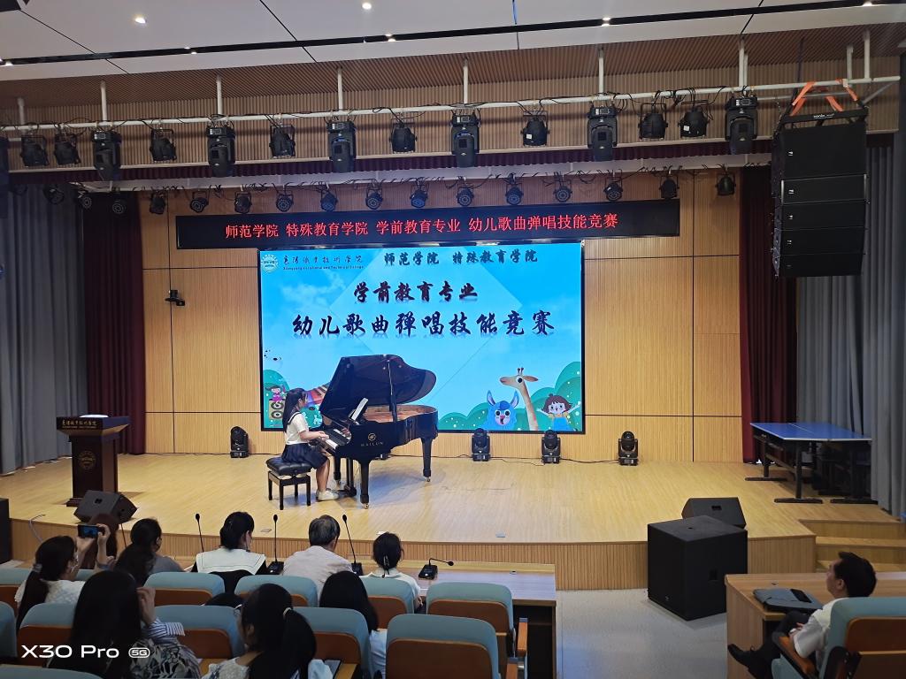5月29日下午,师范学院在学校博学楼演播厅举行学前教育专业“幼儿歌曲弹唱技能竞赛”活动。学前教育20、21级、五年学前教育18、19级共25个班级选派学生参赛。此活动是学前教育专业“月月有竞赛 人人都出彩”技能竞赛月系列活动之一。师范学院院长刘红新、部分学工干部、相关班主任、学前教育专业研究室教师到场组织和观看。