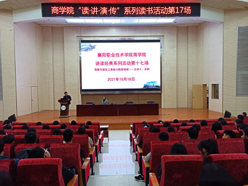 10月18日晚,商学院 “读·讲·演·传”系列读书活动第17场在图书馆二号报告厅举办。本次活动由商学院党总支书记方基志主持,医学院孙莉副教授主讲。2021级全体新生、新生班班主任和中专部100名学生聆听了此次讲座。
