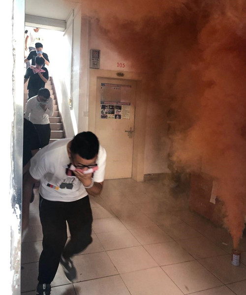 本次演练的主要内容是:模拟宿舍起火后,学生自救逃生。演练现场,学生用湿毛巾或手捂住口鼻,弯腰、迅速有序地沿宿舍楼道跑出,到达应急集合点。演练过程中,指挥人员沉着冷静,学生反应敏捷,出色、圆满地完成了预定科目的演练。