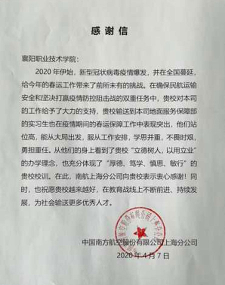 近日,旅游与艺术学院收到南方航空公司上海分公司寄来的感谢信。信中对该院2017级实习生在疫情期间坚守春运岗位给予高度好评。