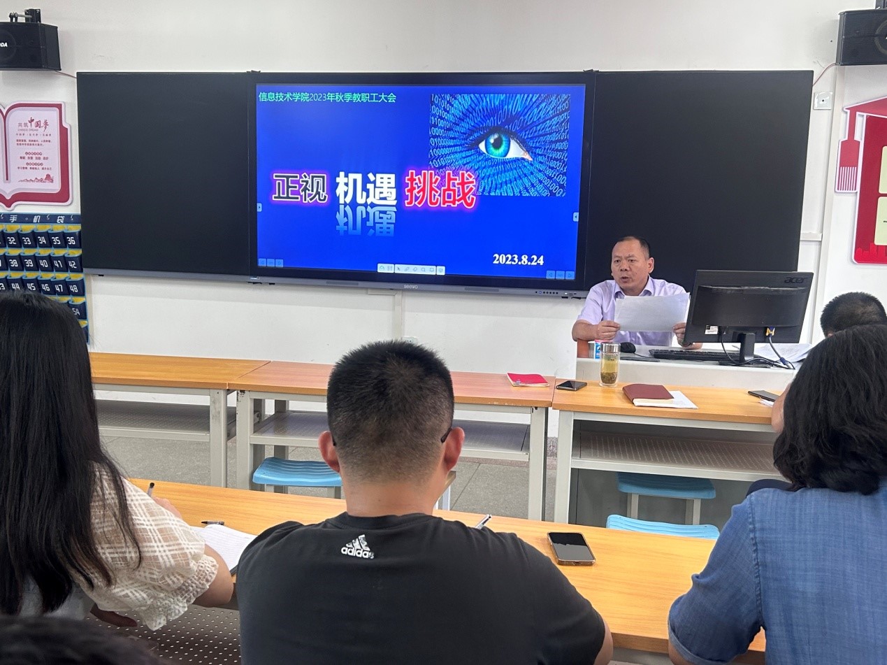 8月24日下午,信息技术学院在智造﹒工业中心B栋401室召开全体教职工大会。信息技术学院全体教职工及武汉美和易思数字科技有限公司襄职项目全体员工参会。会议由党总支书记汤才虎主持。