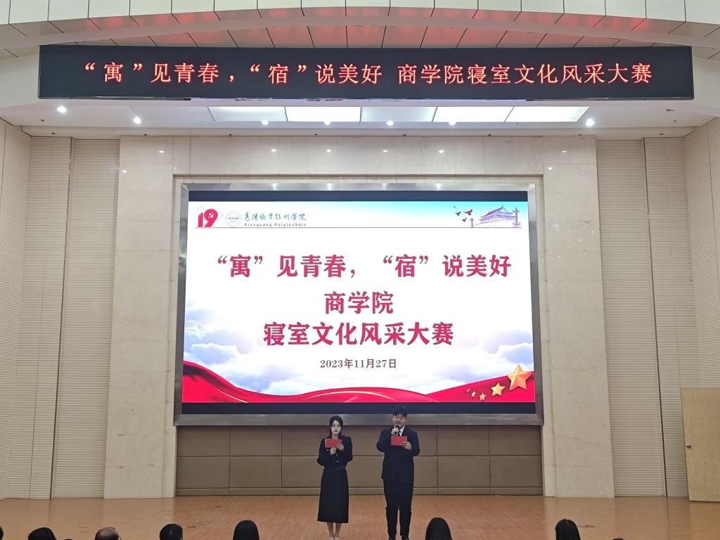为提高学生文明素质,巩固“创文”成果,贯彻落实“一站式学生社区驿站”共建部署要求,11月27日晚,商学院联合后勤产业服务总公司,在图书馆二号报告厅开展以“寓”见青春,“宿”说美好寝室文化风采大赛决赛。共建部门、后勤产业服务总公司主校区物业中心主任何敬治、宿管主管幸琳,商学院学工副院长梁光源、学工科科长房莹,学工科仝宝珍、杨利老师和23级学生代表参加活动。