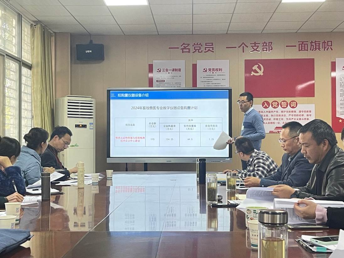 为夯实高水平专业群的硬件设施基础,持续提升农学院实践教学水平,11月20日下午,农学院在健行楼一楼会议室召开2024年现代农牧业专业群仪器设备购置可行性论证会。畜牧兽医行业专家、襄阳市动物疫病防控中心主任冷光敏、襄阳市动物疫病预防控制中心科长薛敏杰,食品行业专家、襄阳市中诚检测科技有限公司总经理谭江艳、襄阳市公共检验检测中心工程师赵小扬,种植类行业专家、襄阳市植保站高级农艺师李新斌、襄阳市农科院高级农艺师赵沙沙,园林类行业专家重点工程指挥部部长张宏杰,襄阳市城市规划设计院总规划师李哲峰,农学院院长赵劲松、副院长杨莎、各专业研究室主任及专业团队参加会议。